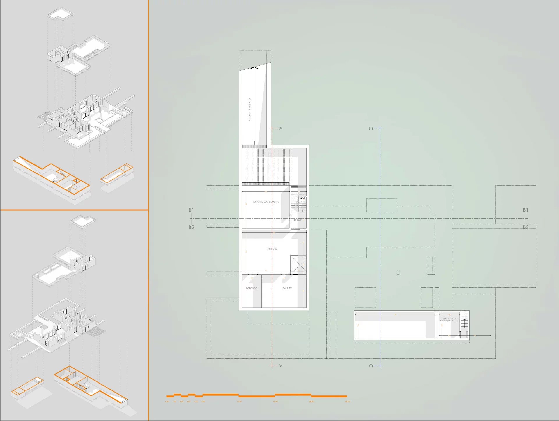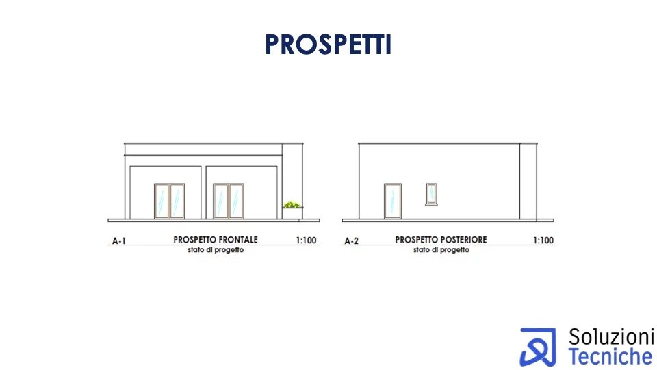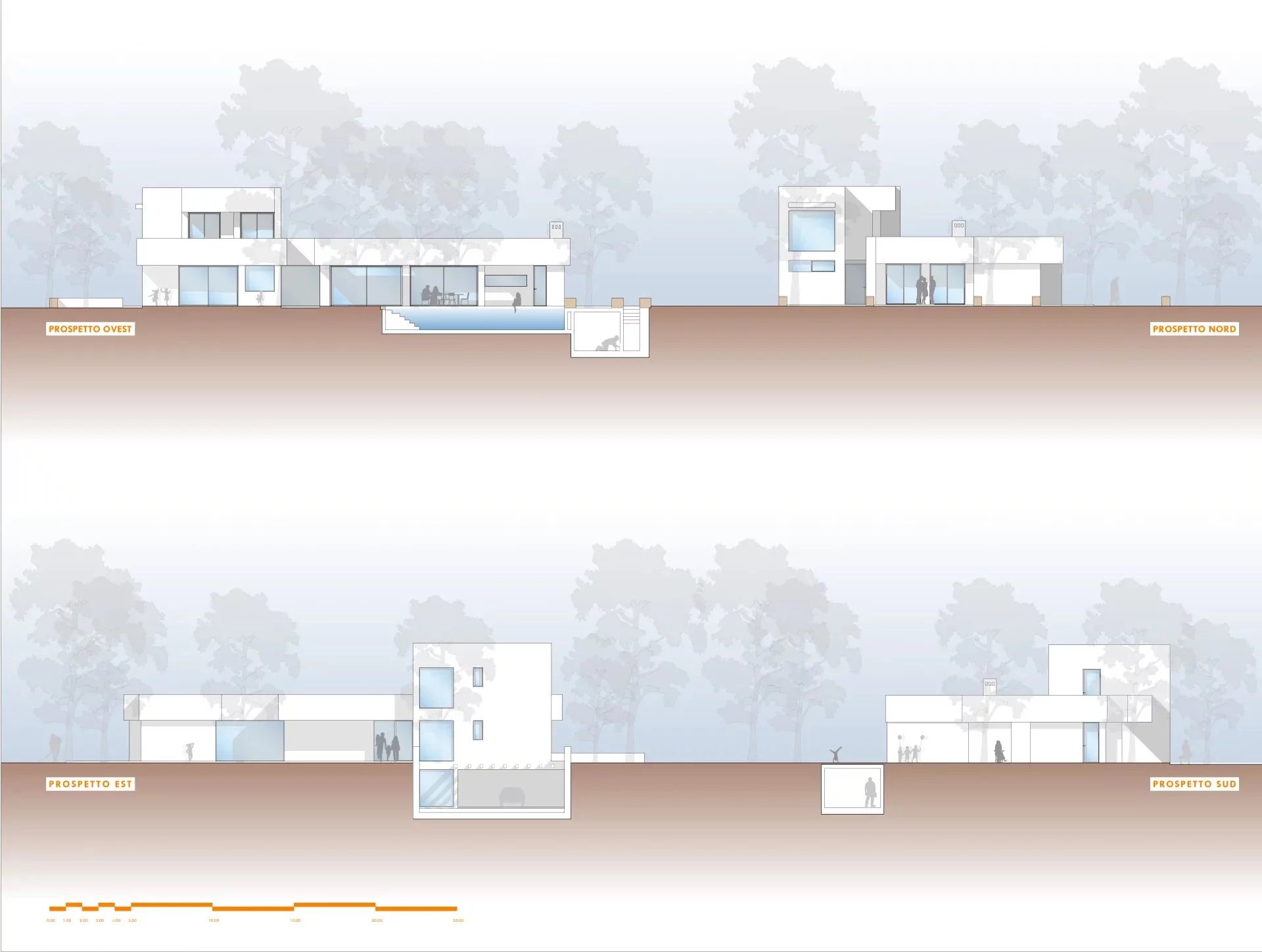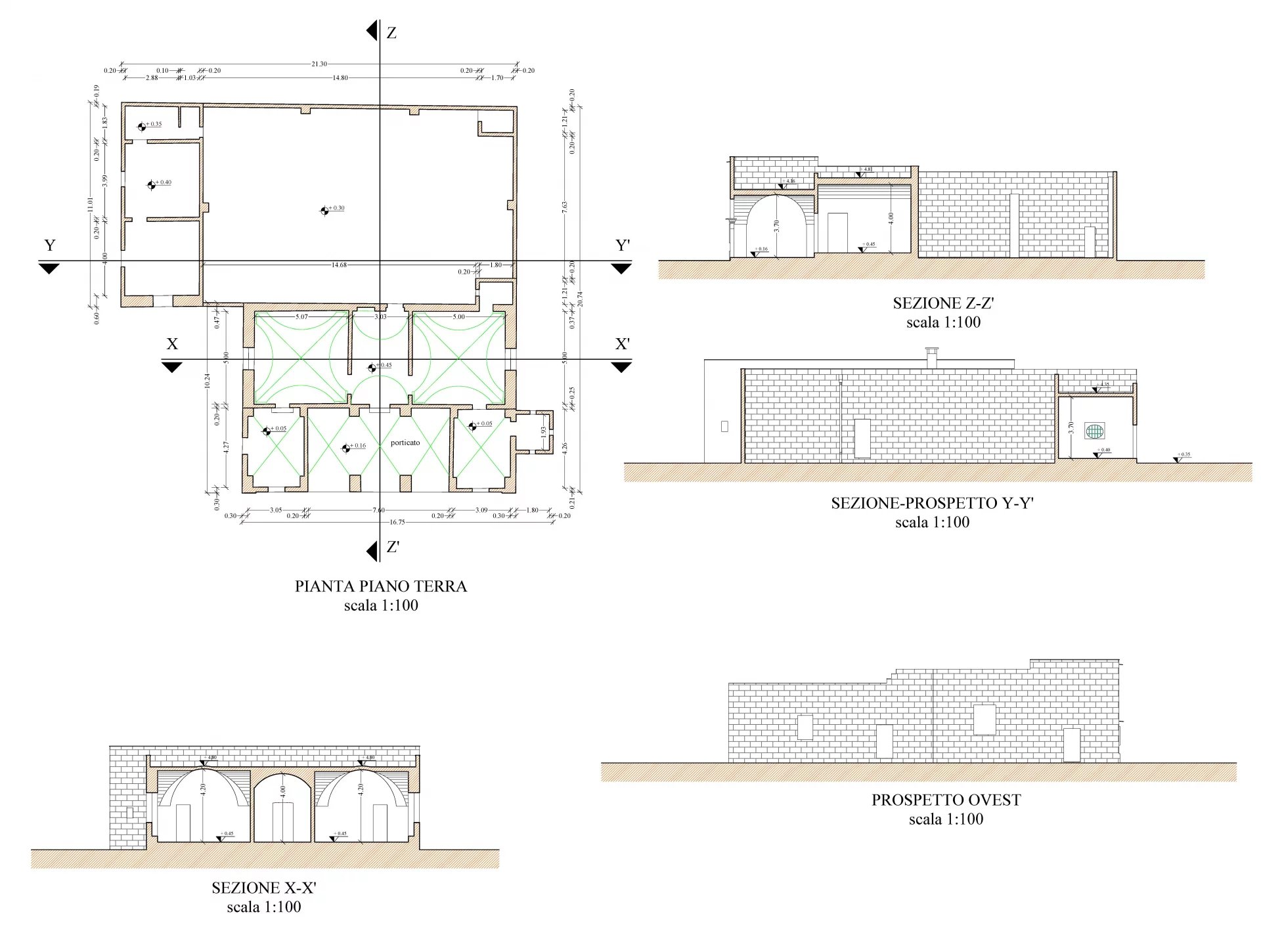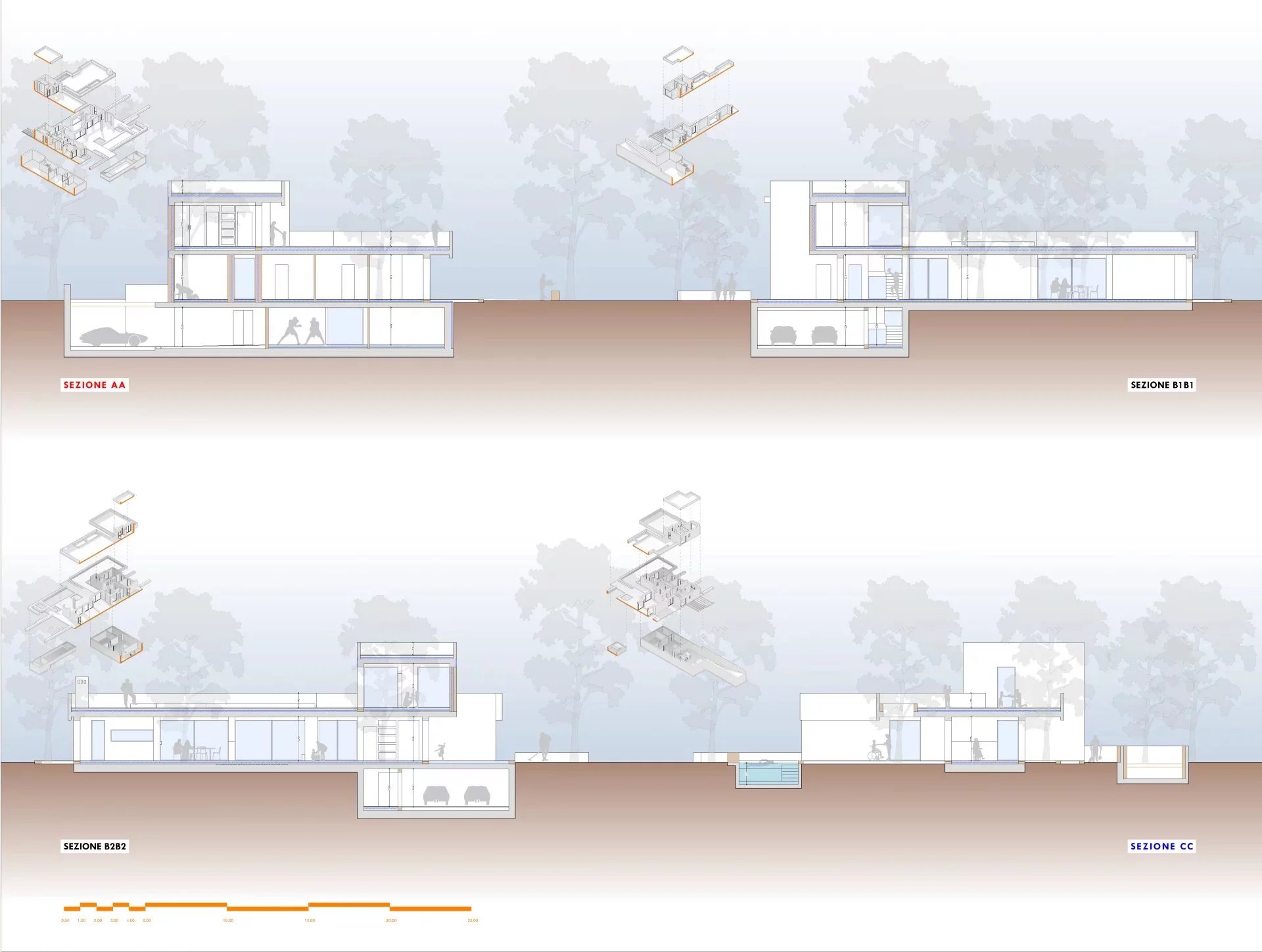 Mostrano la struttura dell’edificio con fondazioni, copertura e integrazione degli impianti; evidenziano l’inserimento nel terreno leggermente in pendenza.