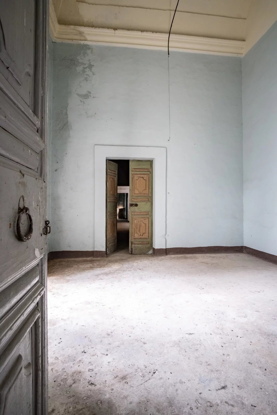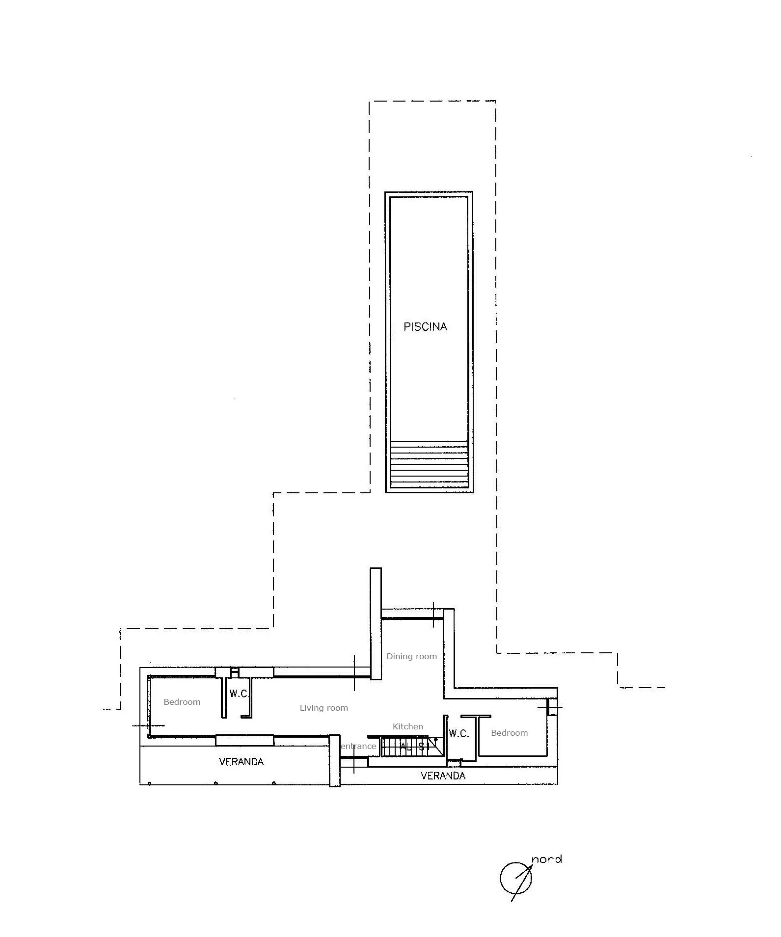 Existing building: Small, historic rural structure (Fabbricato Esistente), preserved and incorporated into the design