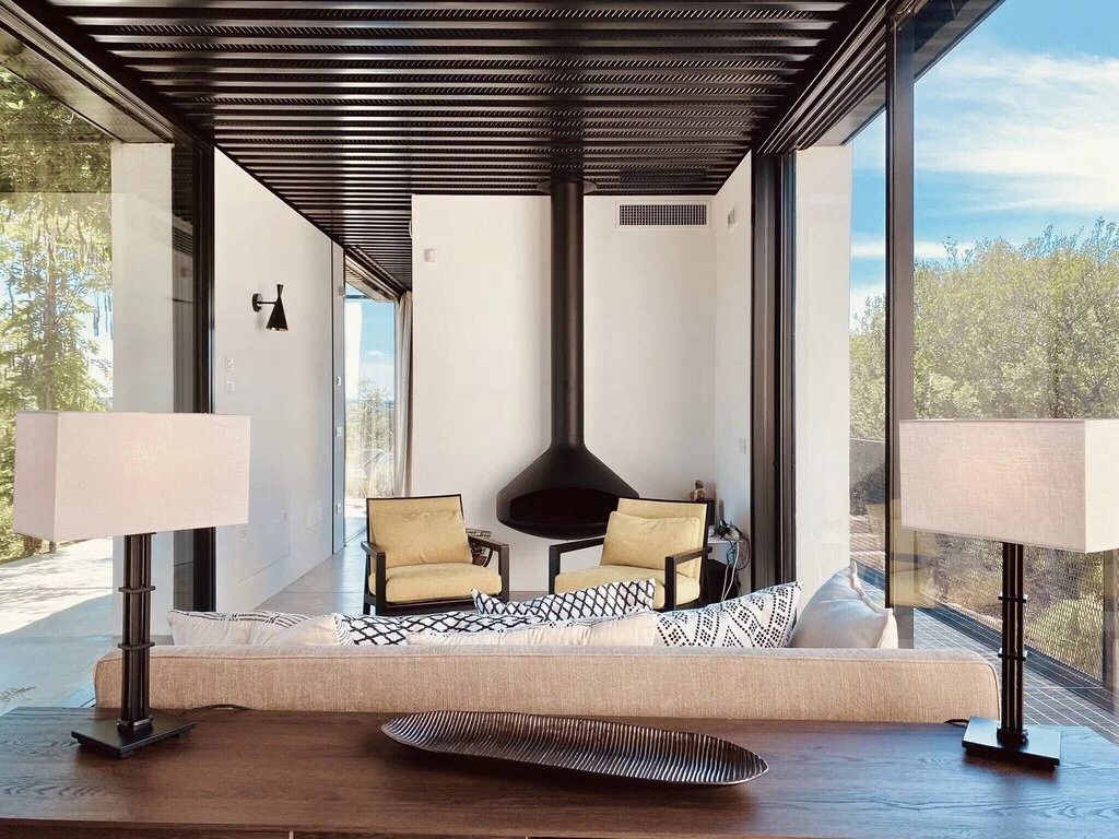Show the harmonious integration of the house into the site and illustrate the interplay between architecture, garden and surrounding landscape.