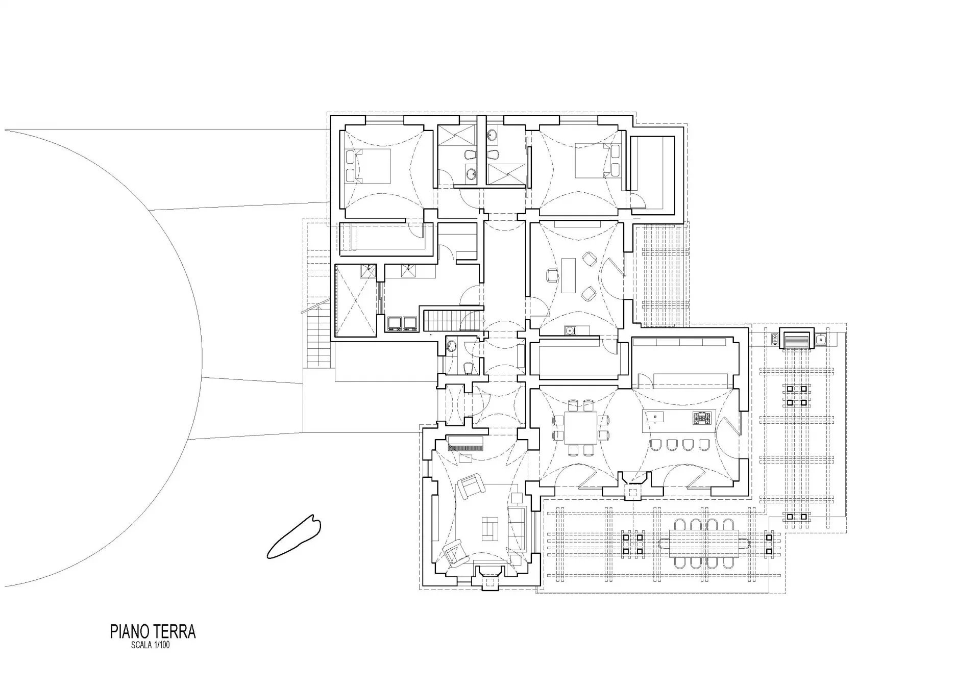 Il progetto integra un Trullo tradizionale esistente con una nuova abitazione moderna a piano unico.